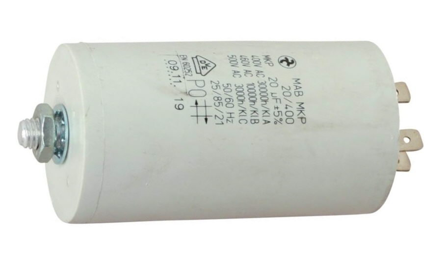 Rozběhový kondenzátor motoru o kapacitě 20uF - 4 kontakty+šroub s maticí .